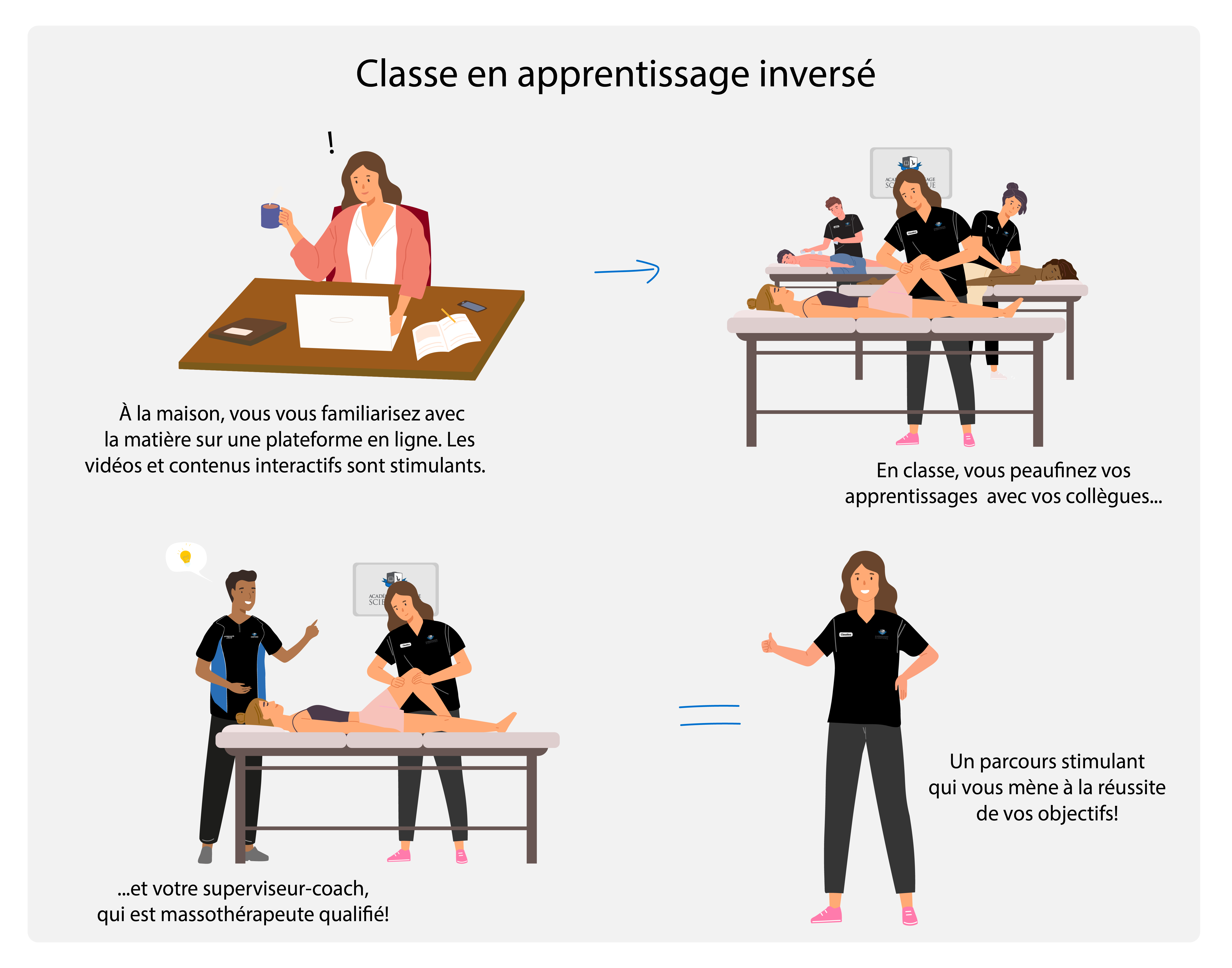 À l’Académie de massage scientifique, nous avons adopté cette formule pour nos formations en massothérapie. Nous croyons que l’étudiant doit être placé au centre de sa formation et être actif dans son apprentissage!